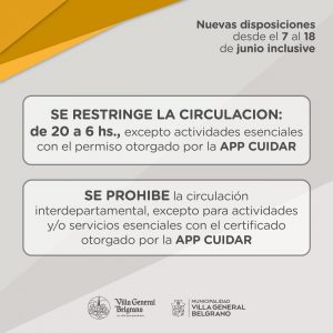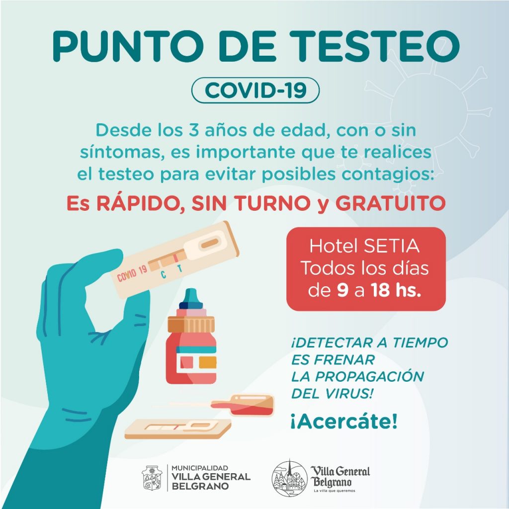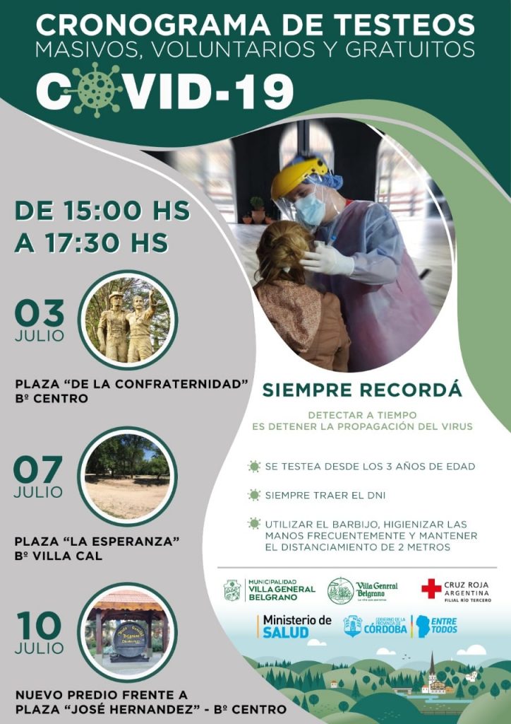 La Municipalidad de Villa General Belgrano continúa reforzando las acciones para frenar la propagación del virus a través de los Operativos Identificar, con el asesoramiento y acompañamiento de Cruz Roja Filial Rio Tercero, que en las próximas fechas de «Testeos Masivos Gratuitos y Voluntarios» se realizarán en Puntos Móviles dispuestos estratégicamente: