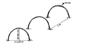 Para su construcción usamos arcos que pueden ser de caña, hierro de construcción del 4,5 mm (el más fino), ramas de siempre verde, etc., que se ubican cada 1 metro. El ancho del túnel puede ser de 1 m a 1,2 m. El largo depende de la superficie disponible, puede ser de 5 a 25 mts.