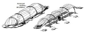 Posteriormente por encima del plástico se ubican arcos cada 1 metro, que no coincidan con los que quedaron por debajo. Con esta técnica “apretamos” el plástico, lo que nos ayudará a correrlo y levantarlo con facilidad a los costados, ya sea para airear y/o trabajar.