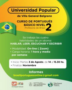 La Universidad Popular de Villa General Belgrano invita al Curso de Portugués Nivel 2 para trabajar en las habilidades de hablar, leer, escuchar y escribir. La modalidad será online (via Zoom) y tendrá una carga horaria de 1 hora y media por semana.