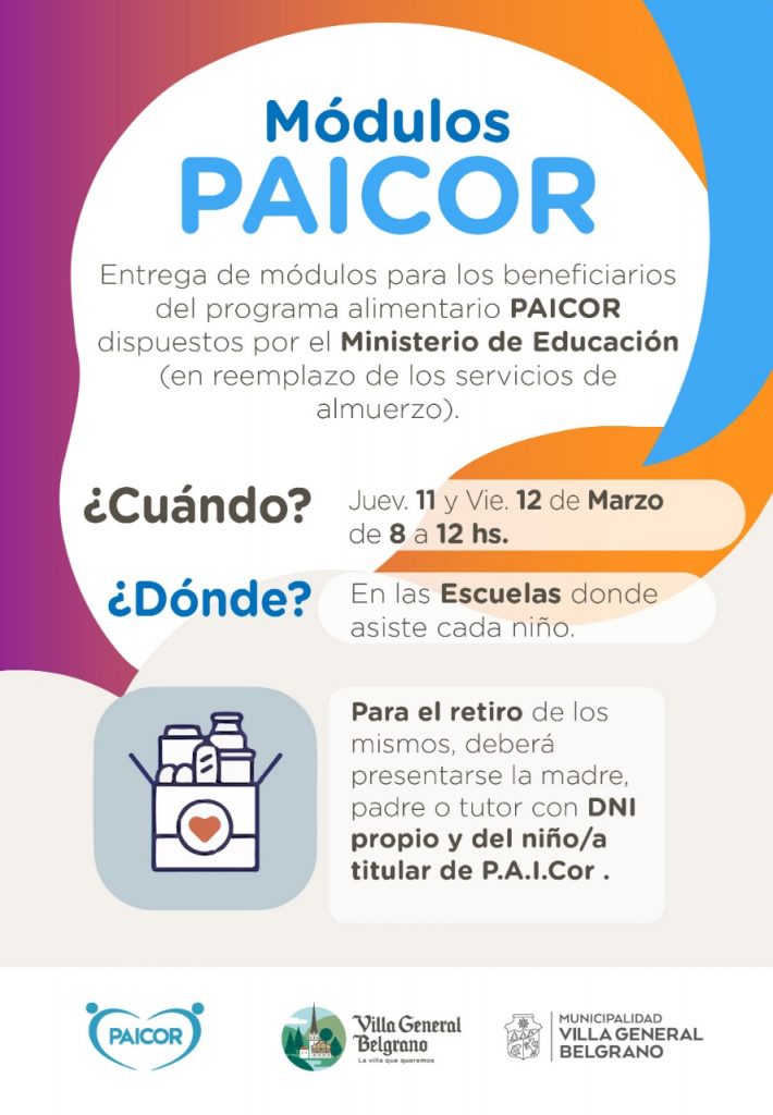 Los días 11 y 12 de Marzo, entre las 8 y las 12 hs, se estará realizando la entrega de módulos para los beneficiarios del programa alimentario PAICOR dispuestos por el Ministerio de Educación (en reemplazo de los servicios de almuerzo)