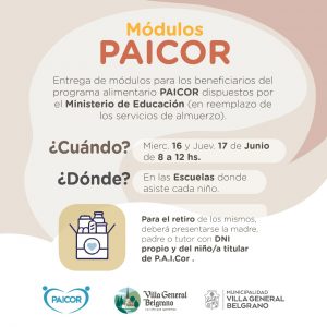 Los días 16 y 17 de Junio, entre las 8 a 12 hs, se estará realizando la entrega de módulos para los beneficiarios del programa alimentario PAICOR dispuestos por el Ministerio de Educación (en reemplazo de los servicios de almuerzo)