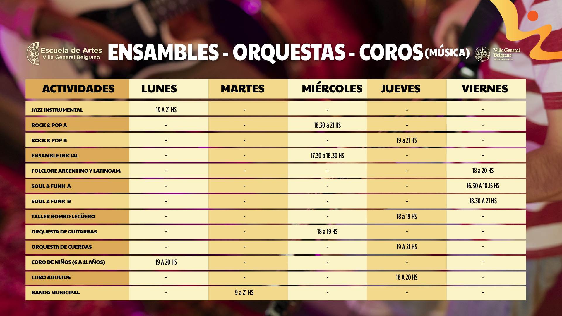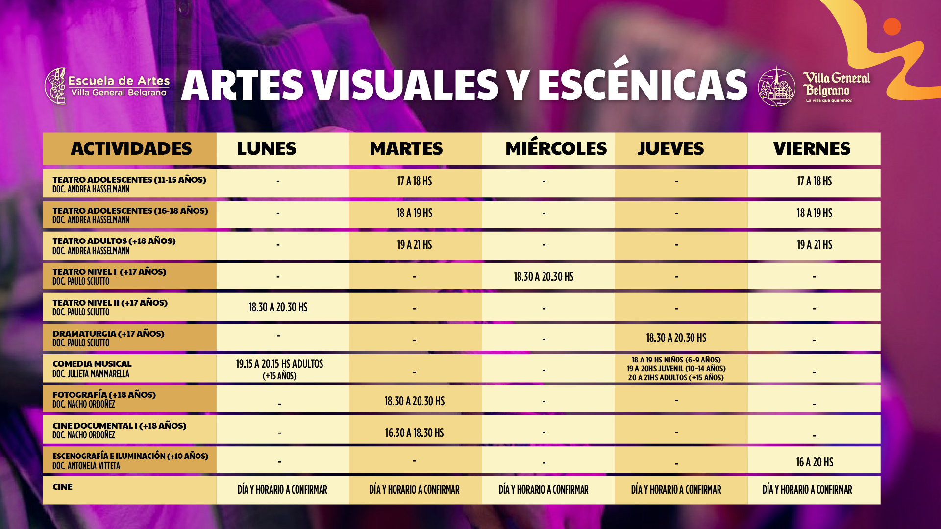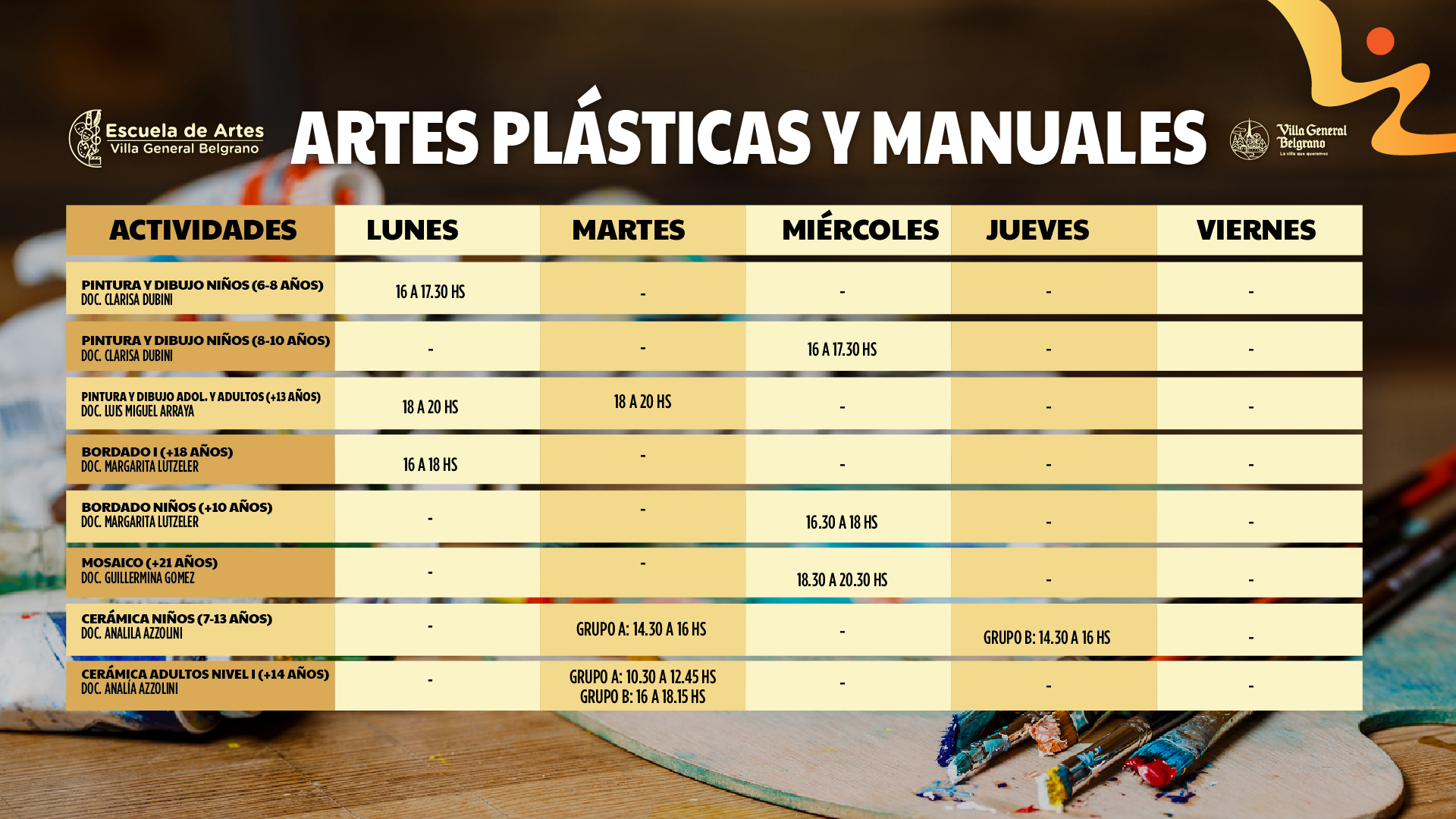 Las artes tienen la facultad de mejorar la calidad de vida de las personas y comunidades. En nuestro pueblo su importancia es fundamental ya que las variadas fiestas y eventos se nutren fundamentalmente de artistas locales quienes tienen la posibilidad de mostrarse ante un público variado y siempre ávido del consumo cultural característico de Villa General Belgrano. La Escuela de Artes es un espacio de encuentro, aprendizaje y recreación, para toda la comunidad.