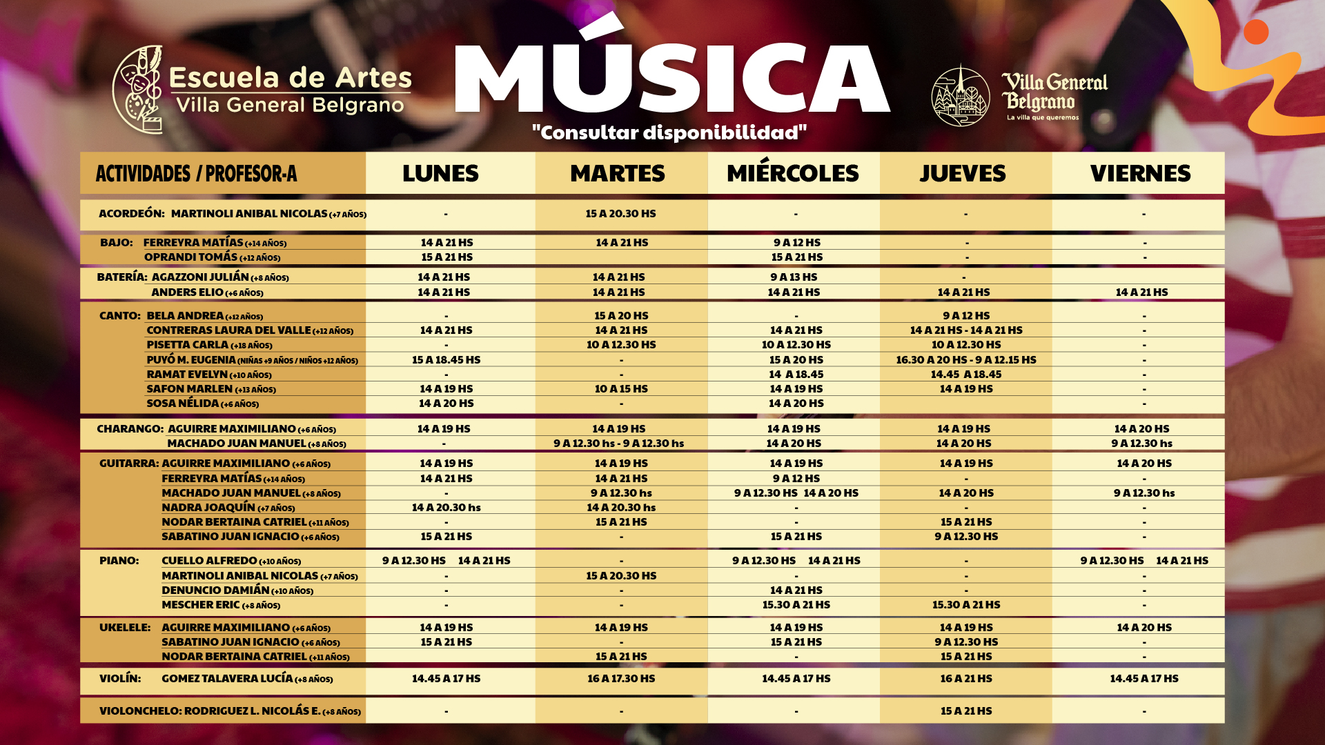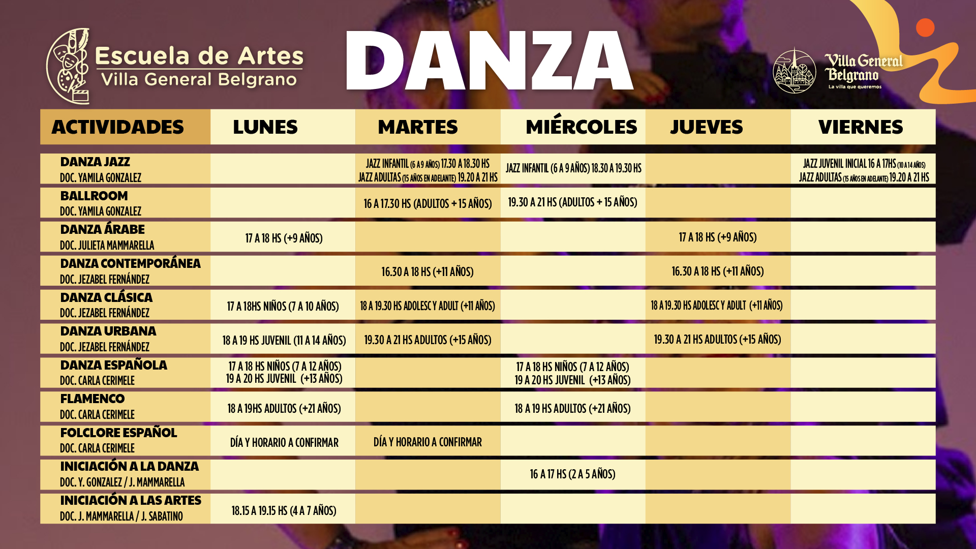 Un total de 45 actividades propuestas por la Escuela con sus correspondientes grupos etarios , espacios y equipamiento, con un plantel Docente especializado coordinado , y una Secretaría que ordena la comunicación y se ocupa de las necesidades cotidianas.