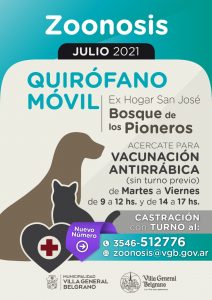 El Departamento de Zoonosis comunica que durante el mes de julio el Quirófano Móvil estará en el Bosque de los Pioneros, del Barrio Oeste. Para vacunación antirrábica podes acercarte directamente de martes a viernes de 9 a 12 hs.  y de 14  a 17 hs.  y podes pedir turno para esterilización telefónicamente al 03546-512776 o por mail a [email protected].