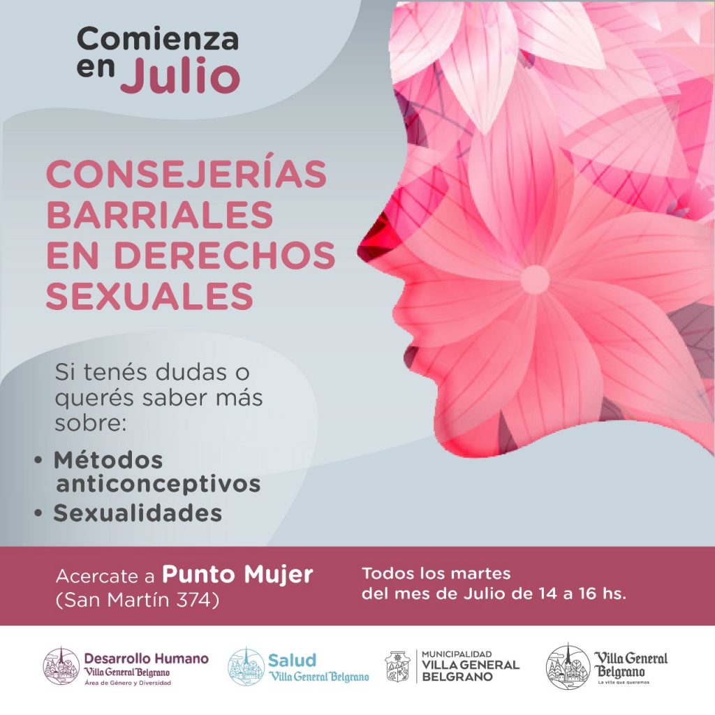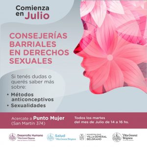 Todos los martes del mes de Julio, en el horario de 14 a 16 hs se realizarán Consejerías Barriales en Derechos Sexuales en Punto Mujer (Av. San Martín 374).